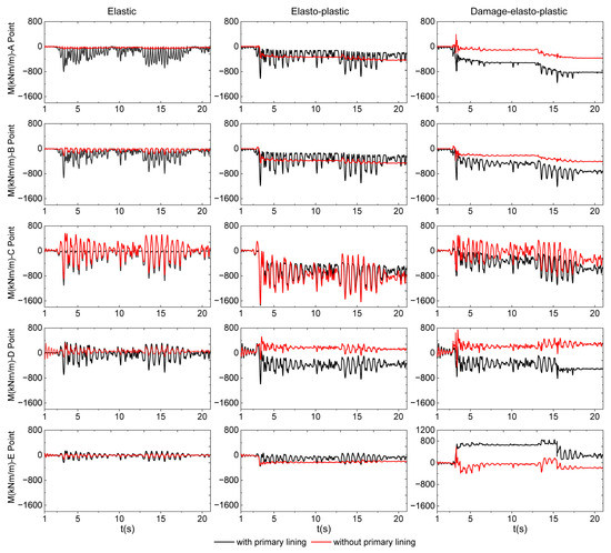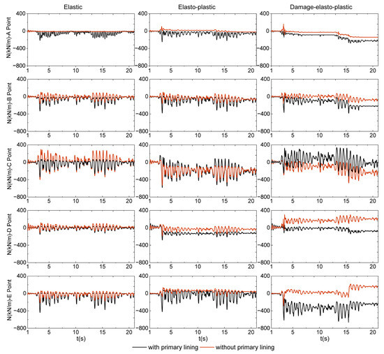 Figure 15 summarizes the time histories of the dynamic bending moment increment at the crucial positions of the tunnel (A, B, C, D, E in Figure 14b). The dynamic bending moment increment, computed for the input motion EQ1 with PGA scaled to 0.2 g, refers to the elastic, elasto-plastic, and damage elasto-plastic analysis of the tunnel. The figure shows that for the three analysis cases, although the primary lining increases the dynamic bending moment of the tunnel at the A, B, D, and E positions, it reduces the dynamic bending moment of the tunnel at the C position.