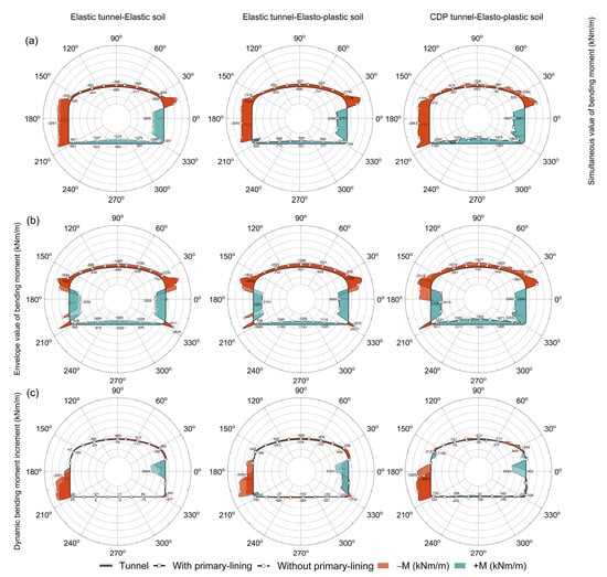 - The distributions and amplitude of bending moment along the tunnel’s perimeter are significantly affected by the primary lining and shaking direction of the ground. Generally, in terms of the simultaneous value of bending moment, the primary lining leads to an increase in the tunnel roof, but a decrease in the bottom plate and side walls. When considering the plastic behavior of the soil and the tunnel, the bending moment of the side wall in the movement direction is amplified by the primary lining, while side walls in the opposite direction are reduced. In terms of the envelope value of bending moment, the primary lining causes the compression area on the inside of the tunnel roof to shrink for elastic analysis, while the compression area on the inside of tunnel to rotate counterclockwise along the tunnel’s perimeter for elasto-plastic analysis.