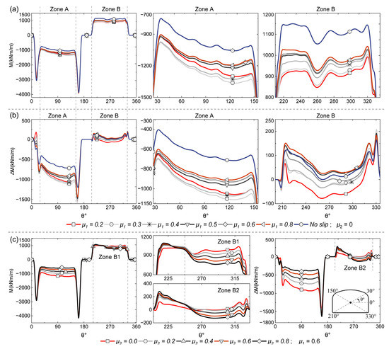 Effect of interface characteristics on bending moment (a) tunnels without and with primary lining (b) tunnels with primary lining; μ1 = 0.2, 0.4, 0.6, 0.8 and no-slip; μ2 = 0 (c) tunnels with primary lining; μ1 = 0.6; μ2 = 0.2, 0.4, 0.6, 0.8.