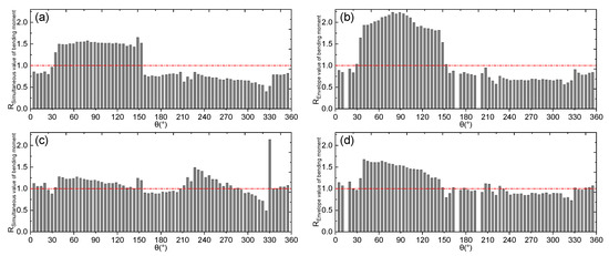 In most cases, the presence of the primary lining causes the bending moments of different parts of the tunnel to increase or decrease. In order to quantitatively analyze the magnitude of this increase or decrease, the bending moment response ratios under different conditions are calculated by Equation (6). The detailed configuration can be found in Figure 14c.
