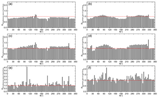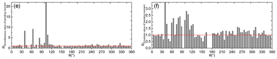 Figure 22 illustrates the response ratio of the tunnel axial force, including the simultaneous and envelope values. The results mainly refer to the elastic, elasto-plastic, and damage elasto-plastic analysis of the tunnel, in which the peak value of the seismic wave is scaled to 0.2 g. The results of elastic analysis (Figure 22a,b) show that the primary lining makes the simultaneous value of the axial force of the tunnel decrease by 14% on average. At the same time, the axial force of tunnel roof (148~157°) is increased by about 15.5% on average. Figure 22c,d portrays the tunnel axial force response ratio in the elasto-plastic analysis. The primary lining causes the simultaneous value of axial force of the tunnel roof (41~166°) to increase by 1~52.3%, with an average increase of 16.7%. The bottom slab (217~334°) also experiences an increase of 11~46%, with an average increase of 16.2%. The axial force of the left wall (170.4~214°) of the tunnel is reduced by 0.2~21%, with an average reduction of 3.9%, while the axial force of the right wall (0~36.3°, 338~360°) is reduced by 0.2~11%, with an average reduction of 3.4%. The primary lining increases the envelope value (Figure 22d) of the tunnel roof (41~139°) by 8.3~35.2%, with an average increase of 21%. The bottom slab (208~331°) also experiences an increase of 7.4~38.4%, with an average increase of 30.3%. The primary lining reduces the axial force envelope value of the side wall (152.4~206.3°, 333.7~356°) by 0.4~5.7%, with an average reduction of 2.7%. The same reduction on the tunnel roof (23.7~36.2°) is 0.4~5.7%, with an average reduction of 17%. Figure 22e,f portrays the axial force response ratio during the damage elastoplastic analysis. The simultaneous value of the axial force can be enlarged by 23% on average for the position where the primary lining amplifies, while being reduced by 13.7% on average for the position where the primary lining diminishes. The envelope value of the axial force can be enlarged by 21.9% on average for the position where the primary lining amplifies, while being reduced by 15.3% on average for the position where the primary lining diminishes.