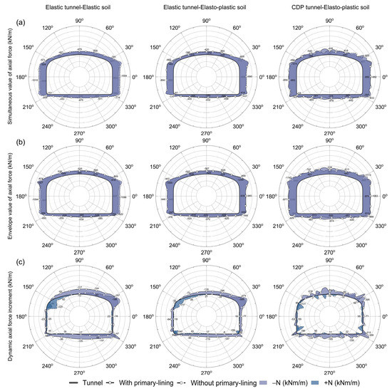 Figure 20 portrays a representative distribution of axial force calculated along the tunnel’s perimeter, corresponding to EQ1, whose PGA is scaled to 0.2 g. This distribution includes the simultaneous value, the envelope value (the maximum value of the absolute value of the axial force in the time history), and the dynamic axial force increment of the maximum positive (+X) shear deformation. Figure 20a illustrates the simultaneous value of the axial force along the tunnel’s perimeter, computed for the elastic, elasto-plastic, and damage elasto-plastic analysis of the tunnel. The axial force distribution is symmetric along the periphery of the tunnel, and the axial force at the tunnel shoulder and side wall is larger than the roof and bottom slab. For the elastic analysis, the primary lining causes the axial force on the side wall and bottom of the tunnel to decrease, but the axial force increases on the roof slab. In the elastoplastic analysis, the influence of the primary lining on the distribution of the simultaneous value of the axial force of the tunnel is related to the direction of soil motion. Specifically, when the soil layer is deformed in the positive direction (+X), the primary lining causes the axial force to decrease on the left side wall, and the axial force on the right side wall increases. However, for the roof slab bending moment and the bottom slab, the primary lining causes the axial force to decrease. The influence of the primary lining on the axial force of the tunnel weakens as the soil yields. When considering the damage and plastic deformation of the tunnel under the dynamic load, the influence of the primary lining on the axial force distribution of the tunnel roof and bottom is more complicated.