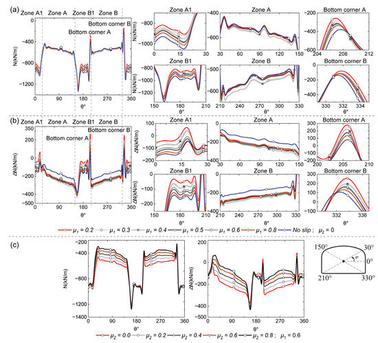 Figure 17 shows the effects of soil–primary lining interface conditions and primary–secondary lining interface conditions on the distribution of tunnel dynamic bending moments. These distributions are calculated at the time step of maximum shear deformation of the tunnel elasto-plastic analysis under EQ2 with PGA = 0.3 g (i.e., the ground is deformed or moved in the negative direction (−X)). For full-slip primary–secondary lining interface conditions, Figure 17a shows that the increase of the soil–primary lining interface friction causes the dynamic bending moment of the tunnel vaults to first increase (i.e., μ1 increases from 0.2 to 0.4) and then decrease (i.e., μ1 increases from 0.4 to 0.8), while leading the dynamic bending moment of the tunnel bottom to increase. The non-slip soil–primary lining interface conditions lead to lower bending moments at the top and higher bending moments at the bottom of the tunnel. A similar comparison was made for the dynamic bending moment increments for the tunnel. The dynamic bending moment increment at the top has the same trend as the dynamic bending moment, while the dynamic bending moment at the bottom of the tunnel has a more complex variation trend with the soil-primary lining interface friction. For the sliding soil–primary lining interface condition (μ1 = 0.6), Figure 17c shows that the increase (i.e., μ2 increases from 0.4 to 0.8) in the friction at the primary lining–secondary lining interface leads to a decrease in the total and dynamic bending moments at the top of the tunnel.