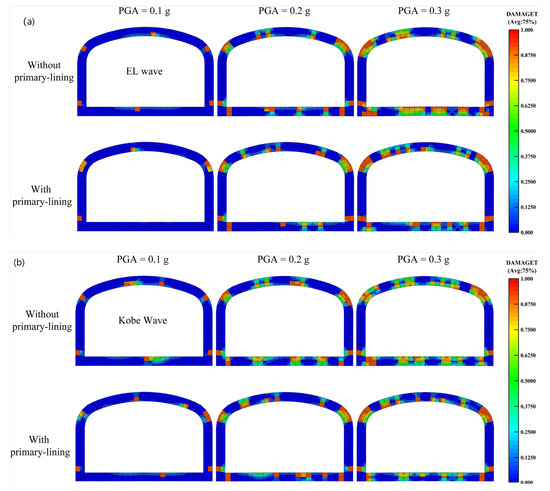 In order to analyze the influence of the primary lining on the seismic damage of the tunnel, the representative results of the tensile failure cloud map of the tunnel are shown in Figure 23. These results mainly refer to damage elasto-plastic, where PGA is scaled to 0.1 g, 0.2 g, and 0.3 g. Figure 23 shows that the tunnel crown, spandrels, corners, and the middle of the floor are all damaged during the earthquake. The damage of the tunnel increases with the increase of PGA. Under the same peak value, the damage of the Kobe wave to the tunnel is more significant than that of the EL-Centro wave.