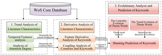 This paper is mainly divided into three parts: the trend analysis of the literature characteristics, the derivative analysis of the data characteristics, and the evolution prediction and analysis of theme words. The evolution mechanism and prediction model are shown in Figure 1.