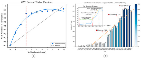 Global Bibliometric Comparison and GVF Test (a) GVF Curve of Global Countries; (b) Time Series Characteristics Analysis of Global Literature Quantity.