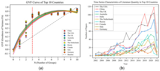 National literature comparison and GVF test (a) GVF Curve of Top 10 Countries; (b) Time Series Characteristics of Literature Quantity in Top 10 Countries.