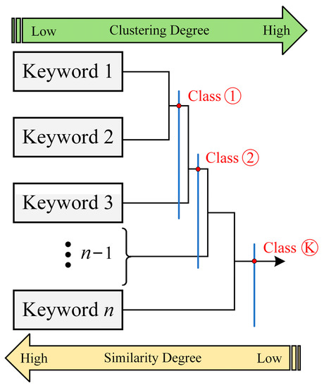 Data characteristics of keywords determine the generation path and shape of the tree, and keywords with high data similarity are preferentially clustered until the only cluster with the highest discrimination is formed. UPGMA is a clustering method to calculate the distance between two clusters that can identify the relationship between objects and the degree of clustering [30]. Eventually, we determine the degree of co-occurrence between keywords. The principle is shown in Figure 4.