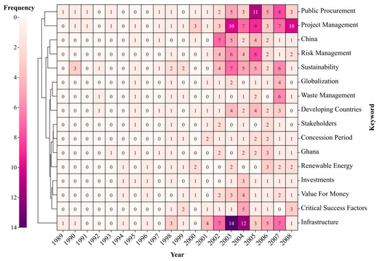 As shown in Figure 5, the exploration period is the embryonic stage of PPP research. The main research content concerns infrastructure and is followed by public procurement and project management. Moreover, the keywords outbreak stage of this period is concentrated in 2002–2008.