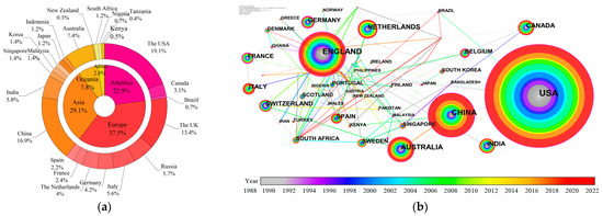 - Country collaboration network analysis can measure the scientific research strength of the country in this field. Among them, the connection color indicates the time of national cooperation, and the node size indicates the number of pieces of literature in each country, as shown in Figure 8b.