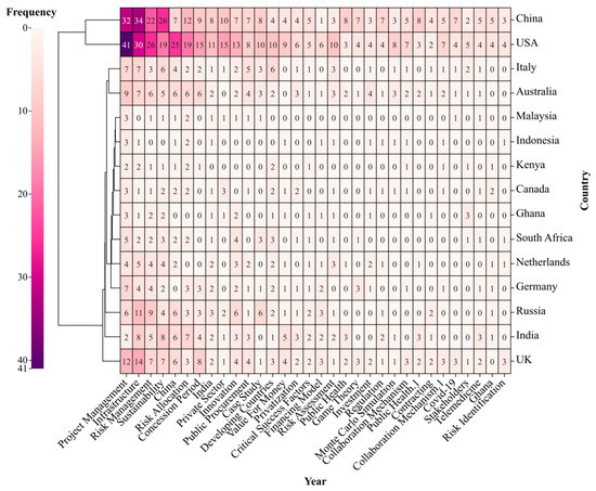 - On the contrary, the total number of pieces of literature between China and the USA is similar. PPP literature in the USA has always been significantly ahead of China, and shows a steady growth trend from 2002 to 2017. However, the strong development period of PPP research in China is mainly concentrated in the second half of this period (2017–2022). It can be shown as: the China Public Private Partnerships Center (CPPPC) was officially approved in 2017, and the number of PPP-related policies promulgated also exploded in China. Until 2016, the number of joint policy enactments accounted for 35.6% of the total number of policy enactments [28]. Therefore, under the effective promotion of national policies, Chinese PPP practice and academic research received unprecedented attention [29]. Moreover, the number of PPP publications in China began to surpass that of the USA in 2017 and maintained a relatively stable growth rate.