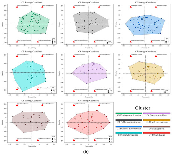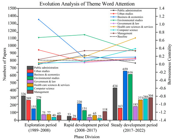 First, according to the attention evolution of theme words, the mainstream evolution directions are determined as: environmental studies, public administration, business and economics, computer science, government and law, health care sciences, management, and urban studies. In addition, we count the frequency of keywords for related theme words in the steady development period. Eventually, we calculate the most novel keywords and classify them reasonably, applying R Studio to draw a diversion prediction diagram for keywords [63], as shown in Figure 13.
