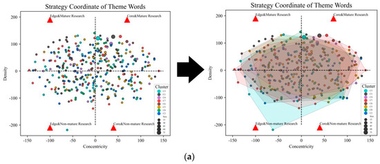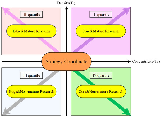 - Co-word analysis. This method can reflect the cascading relationships between objects. Among them, betweenness centrality is the key indicator to measure the importance of nodes in the network [15]. It is generally believed that keywords with betweenness centrality greater than 0.1 occupy a core position in the network [16,17]. This paper used CiteSpace 6.1 R3 to analyze the academic cooperation between countries and determine the intensity of cooperation between countries and the mainstream research countries. Moreover, we also used strategic coordinate analysis to mine the centrality and density of theme words, determining the position of each theme word in the strategic coordinate graph and analyzing the evolution trends [18].