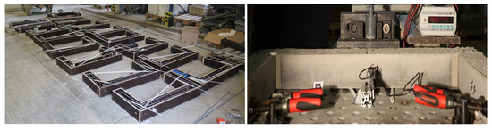 Regarding the small thickness of the plastic formwork (1 mm), deformation may occur when pouring the concrete due to the weight of the fresh concrete. The chosen solution was to pour the concrete on both sides of the formwork simultaneously. Additionally, 10 mm plastic pipes were located in the framework for passing the longitudinal post-tensioning screws, with no connections between the concrete and the screw, as in Figure 1. The physical tests were carried out 28 days after mixing the concrete, and the same post-tensioning force on the testing day was applied to the nuts at the end of each longitudinal screw, as in Figure 1.