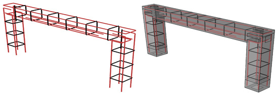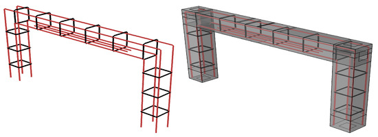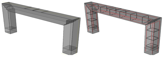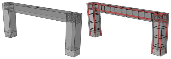 The strength of the section was calculated as a general measure of the capacity of the elements and estimated the accuracy of the tests. With reference to the standard ACI and the calculations of the Section Designer of SAP2000, the bending capacity of the section with no compressive rebars and no post-tensioning effect (section 10 mm) is kN·m. On the other hand, in the reference monolithic frame (shown in Figure 3) in the presence of the compressive rebars and the post-tensioning load, the bending capacity of the section should be kN·m. Likewise, regarding the concrete properties ( 45 MPa) and the selected stirrups ( 6 mm ≃ @12.5 cm), the standard shear capacities () are 18 kN. The design standard has a safety factor, (e.g., safety factors ( kN), and the selected distances between the stirrups (12.5 cm) did not follow the considerations of the standard.