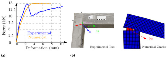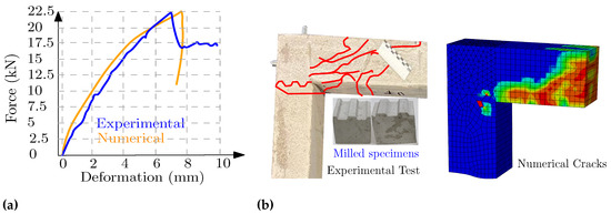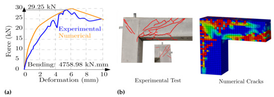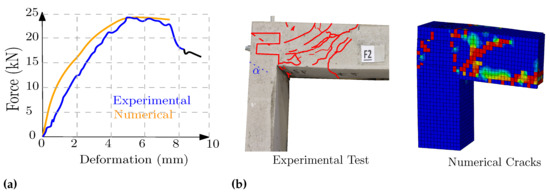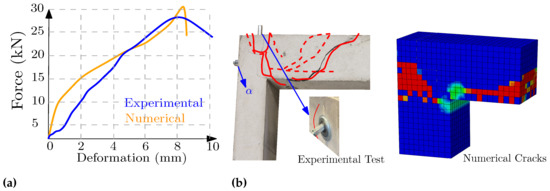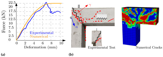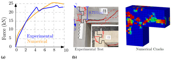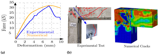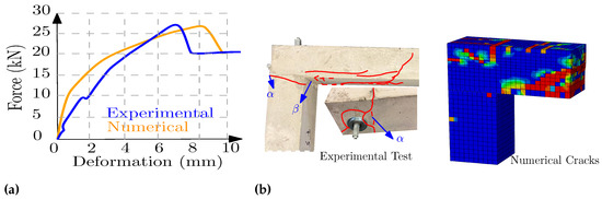 F0, (a) Force–deformation, (b) experimental cracking and numerical cracking pattern.