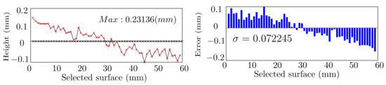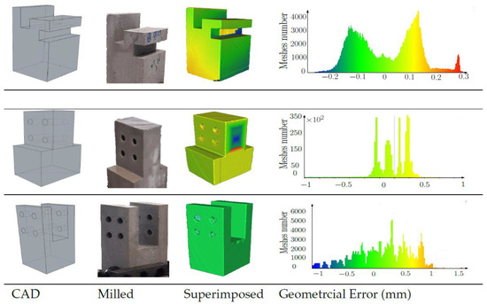 Another main difficulty is the geometrical tolerances in the final manufactured process. In order to measure the accuracy of the mill surface smoothness (2D) and mill geometry (3D), the milled specimens and the initial CAD models were compared together, using two different scanning methods. In the surface evaluation, the geometries of milled elements were scanned by a microlayer scanner, and the scanned points were mapped to the points coming from the CAD file. Comparing these two groups of data utilizing the codes developed in MATLAB could give data about the accuracy of this process. As an example, MATLAB codes produced by overlaying and measuring the differences in Z direction concluded that the standard deviation of the geometrical error is (: 0.07 mm), while the maximum error amount is 0.23 mm, as in Figure 24. For comparison of the 3D geometries, the software CloudCompare was employed. The 3D scan results with 0.5mm mesh size and the 3D CAD file were located over each other, and the geometrical error was measured. The calculation showed that the range of the maximum errors in them all is between [−1.5 and +1.1 mm], as in Figure 25. Despite the tolerances, these elements were easily fitted. Various reasons can influence the tolerances: