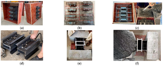 Figure 6. Fabrication procedures of specimen: (a) Formwork of precast slab; (b) Defect arrangement; (c) Casting concrete; (d) Welding stud; (e) Assemble; (f) Pouring connection concrete.
