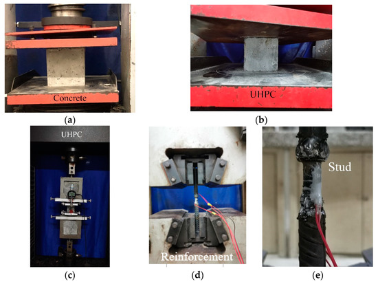 Figure 7. Testing of material properties:(a) Concrete; (b) UHPC; (c) UHPC; (d) Reinforcement; (e) Stud.