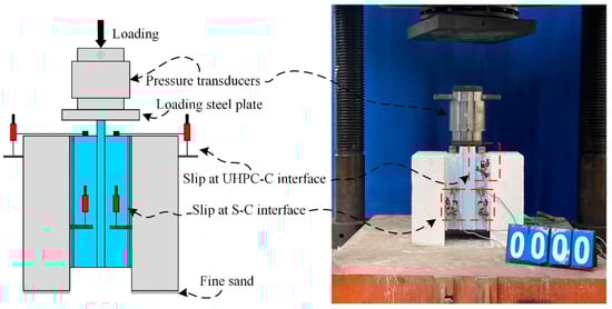 The test specimens were loaded by a 1000 T microcomputer-controlled electro-hydraulic servo press for static monotonic loading. A layer of fine sand was evenly laid at the bottom of the specimen and the loading steel plate. Three preloads, with an amplitude of 0.3 times the predicted ultimate load, were applied before the formal loading to eliminate the gap between the specimen and the press and to check whether the measuring equipment was working correctly [30]. After completing the preloading, the test was controlled by force loading at 2 kN/s, as shown in Figure 8. The pressure transducer reads the applied load on the specimen. Figure 9 shows the four displacement transducers used for measuring the relative slip between the steel box and the precast concrete slab. The relative slip between the UHPC and the precast concrete slab was measured using two displacement transducers.