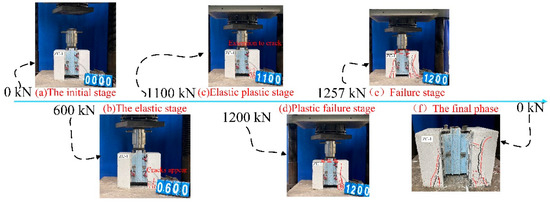 At the initial loading stage, no cracks were generated at the precast slab, and no slip appeared at the interface of the UHPC and precast concrete slab, but the slip at the interface of steel and the precast slab grew slowly. When the load reached 0.47 Pu (Ultimate load capacity), a micro crack appeared on the right side of the precast slab. Later, as the load increased, the cracks gradually extended upward to both sides. When the load reached 0.87 Pu, a small slip appeared at the steel-UHPC interface. Subsequently, when the steel-concrete slab slip reached 3 mm, the whole member continued to sound like concrete cracking. When the slip reached 7.5 mm, and the load reached the Pu, the specimen produced a loud sound. However, the steel-UHPC interface was not immediately damaged, and a steady decrease in bearing capacity occurred after a certain degree of interface slip. Finally, the slip at the interface of the steel box and precast plate kept increasing. The specimen emitted a continuous ringing sound until the loading stopped after the load suddenly dropped to 0.6 Pu. The loading process is shown in Figure 10.