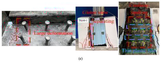 Figure 12. Failure state of specimens:(a) Failure form of specimens of ZC group; (b) Failure form of specimens of TK30 group; (c) Failure form of specimens of TK60 group.