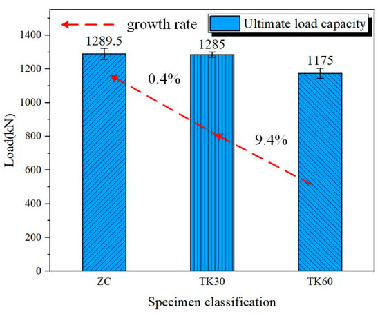 Figure 14 and Table 3 give the ultimate bearing capacity of each specimen. The maximum ultimate bearing capacity of the fully-bonded interface specimen is 1322 kN, the minimum is 1257 kN, and the average is 1290 kN. The maximum ultimate bearing capacity of the 30% interface defect specimen is 1301 kN, the minimum is 1269 kN, and the average is 1285 kN. The maximum ultimate bearing capacity of the 60% interface defect specimen is 1205 kN, the minimum is 1145 kN, and the average is 1175 kN. The difference in ultimate bearing capacity between naturally bonded interface specimens and 30% interface defect specimens is slight, about 0.4%. The ultimate bearing capacity of 60% interface defect specimens is 115 kN smaller than that of ZC group specimens on average, which is 9.4% lower. Therefore, it can be concluded that the ultimate bearing capacity of the full bond interface is optimal. However, the interface defects are less than 30%, and the influence on the ultimate bearing capacity can be negligible.