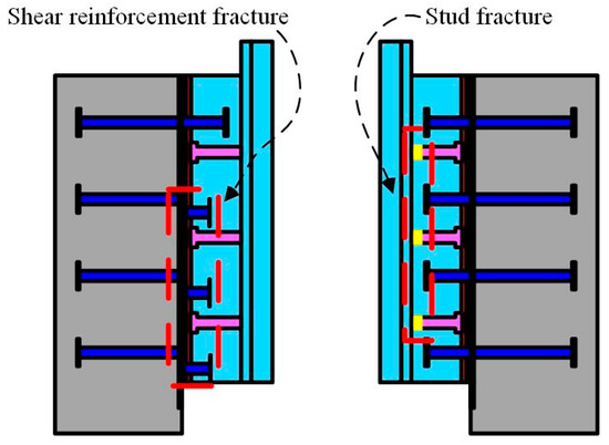 According to the results of this push-out test, when the shear strength ratio of shear reinforcement to the stud is 1.09, the failure mode of the PSCC connector exhibits the shear failure of the shear reinforcement. To investigate another failure mode of PSCC connectors, the shear strength ratio of the shear reinforcement to the stud is increased by increasing the cross-sectional area of the shear reinforcement, which eventually leads to the shear failure of the stud. The final failure mode was determined by varying the shear strength ratio (Figure 24). Therefore, based on the experimental design and with the material strength kept constant, the shear reinforcement diameter was increased from the initial 12 mm to 14 mm and 16 mm to analyze the mechanical properties of the PSCC connectors at different section ratios.