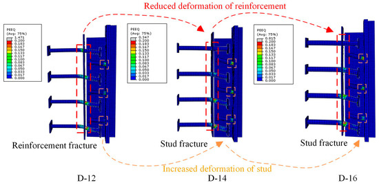 In Figure 26, the strain at the root of the reinforcement pre-embedded in the UHPC gradually decreases as the diameter of the shear reinforcement increases, and the strain at the root of the stud gradually increases. When the shear reinforcement diameter is 16 mm, the failure mode of the PSCC connection is stud shear failure. The results show that when the material properties are the same, the ratio of shear reinforcement to stud section is 1.55. The failure characteristics of PSCC connectors show stud shear failure.