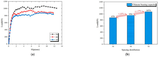 Figure 28. Analysis results of spacing arrangement: (a) Load-slip curves; (b) Comparison of ultimate shear capacity.