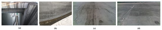 We use a negative-pressure adsorption wall-climbing robot as shown in Figure 1b, carrying an Realsense D435i RGB-D camera, Intel, Santa Clara, CA, USA (the color and depth images’ resolution is 480 × 848 and the frame rate is 30 frames per second), to stably crawl on the surface of the sidewall of the Three Gorges Dam’s drift spillways. The robot is secured by a safety rope and powered by a power cord. We operate the robot move on the dam’s vertical surface and collect sequence images through the robot operation system (ROS). We choose some typical images with multi-class defects and label them as shown in Figure 3.