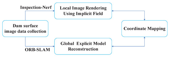 Three steps need to be completed to obtain a local image of a specified viewpoint. First, a stable, precise, close-up image of the spillway sidewall surface is acquired. Then, build a global 3D model of the environment. Finally, ensure the global coordinates can map to the input position-encoded coordinates of the neural radiation field model, as shown in Figure 2.