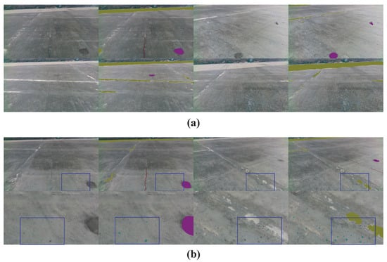 Image collection and labeling. The collection’s original images are shown in the first and third columns. Labeled images are shown in the second and fourth columns. (a) shows the original images themselves, (b) the second row shows zoom-in visualization of the first row in the blue box. Labeled defects include cracks in red, patched areas in ochre, erosion in purple, and spots in nattier blue.