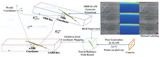 Global-to-local coordinate mapping. Establish our global-to-local inspection methods. After collecting surface RGB-D images, we label surface defects as shown in the right column using the same color as Figure 3. Using ORB-SLAM to generate images pose and global point cloud and register labeled images to point cloud. After that, use Equation (1) to transform points from the global coordinate to AABB coordinate. Finally, scale the AABB box to the neural radiance field bounding box. (The coordinate origins of OBB box and AABB box are coincident. For the convenience of observation, they are drawn separately in the figure).