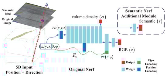 The input of Nerf are points position on image pixel rays and corresponding ray direction vector , x denotes the 3D sample point’s position, and is a unit vector representing the sample ray’s direction. The outputs render RGB images from different viewpoints. Then, the Nerf can present a 5D scene as a MLP network as shown in Figure 5. present the volume density and c present the volume RGB color. After supervised training to optimize its weight , Nerf can map each input 5D coordinate to its corresponding density and directional color. The implementation of Nerf comprises three parts: position encoding, sampling strategy, and color rendering equation. The color rendering equation is the core, as shown in Equation (2). The predicted color is obtained by weighting the color of the sampling points along the ray direction. The weight value of the sampling point is represented by the density difference in the sampling interval .
