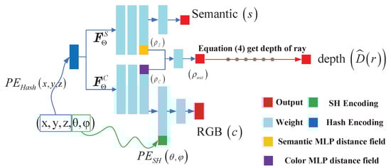 The feature output of the semantic MLP branch is used as the input of the classification MLP. Finally, the probability of each category is output through the Softmax layer. After the features of the color MLP branch are concatenated with the features encoded in the SH direction, the predicted values of RGB are obtained through a color rendering MLP layer. The integral equations of semantic labels and color values are shown in Equations (5) and (6). Color and semantic rendering using different MLP networks ( in Equation (5)). denotes the semantic logits of a given volume in Equation (6). The color rendering equation is same as Equation (2).
