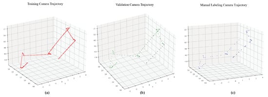 During the global model-building process, the SLAM method generates the pose matrix of each image. We chose 2441 color images as the training set containing 59 semantically labeled images. Other 127 images are used as test images, with 6 semantic labeling images. Part of the defect labeling images and original images are shown in Figure 3. The actual coverage of the dam sidewall by the image collection is 17 × 13 m. Figure 7 shows the camera trajectory positions of training, validation, and labeling images. To see the points of the training image pose clearly, only in (a) do we show one-fifth of the trajectory points.