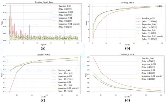 Training and validation results. (a,b) depict changes in depth loss and average PSNR during training, respectively. (c,d) depict the averaged PSNR and LPIPS metrics during validation testing.