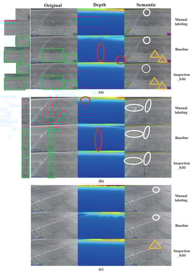 The green boxes in the original columns show that the Inspection-Nerf model can render spots and crack on the surface in more detail than baseline models. The red ellipses in the depth column indicate that the baseline model usually renders depth values inaccurately within the semantic area, especially crack areas. Our model’s depth results within semantic areas are as accurate as the ground truth. On the semantic column of Figure 9, white ellipses indicate semantic information that is missing or ignored when manually labeling. Due to viewing angle limitations, manual labeling often overlooks defects at long distances. Cracks are ignored in (a)–(b), and erosion labels are ignored in (c). After training on images collected in sequence, Nerf-based methods can recover the long-distance neglected semantic information in a single image through multi-view input. The orange triangles in (a) and (c) show that Inspection-Nerf can retrieve more semantic information than the baseline. It indicates that Inspection-Nerf has learned more scene semantic structure information, which is more conducive to grasping complete surrounding environment semantic information when viewing local details. In order not to lose generality, we also count the average recall and f1-score of Inspection-Nerf for manual labeling defects, which are 0.958 and 0.778, respectively. This shows that our model can not only retain most of the semantic information of human labels but also make up for the information ignored by human labels.