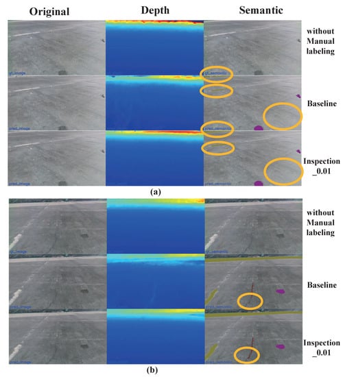 For unlabeled images, Nerf-based methods can also recover semantic information. As shown in Figure 10, these images have no manual labeling for training. We can compare it with Figure 9a,b and Figure 10a,b. Since it is sparsely labeled, Figure 10a,b around the manual labeled Figure 9a,b has no semantic information. Through training, our model can restore the semantics of the images in the surrounding unlabeled viewpoint area, and the semantic recovery information is better than the baseline model. The upper orange ellipse in Figure 10a is intended to represent the recovery of distant semantic information, and our method is also better than the baseline. The reason for this phenomenon is that, as seen from the predicted depth map, the proposed method versus baseline provides more smoothes the depth prediction of distant information, which may make it easier for the model to map semantic information to specific locations, making semantic prediction more complete. The orange circles show that Inspection-Nerf can retrieve more semantic information than the baseline model. Finally, Inspection-Nerf can generate all 2568 collection images’ semantic masks only using 59 labeled images as semantic ground truth to train. Our model can synthesize 1.6 GB original and depth images from different trajectory viewpoints only using 388 MB parameters. And semantic mask images for all images can be generated additionally.