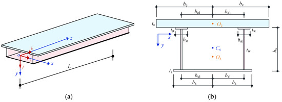 Figure 2 shows the definition of the geometrical parameters of the I-beam or box combination beam, where Oc is the centroid of the concrete slab, Os is the centroid of the steel beam, and Cs is the torsional centroid of the transformed section of the composite beam.