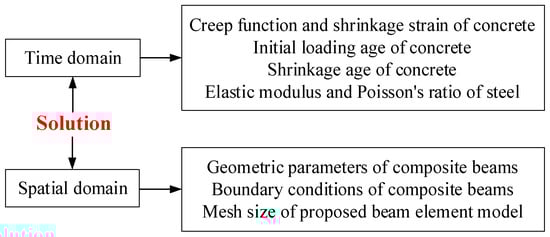 Combining the above calculations in the time and space domains, a solution procedure for a two-node finite beam element model with 18 DOFs of the composite box beam considering slip, shear lag, and time-dependence is proposed: