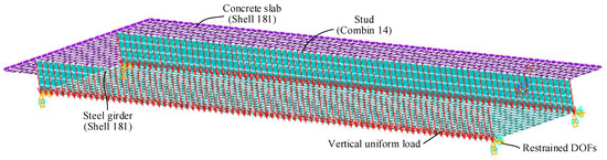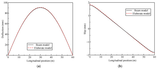 One-dimensional models that consider interface slip, shear lag, and time-dependent behaviors [17,18,19,20,21] have been widely utilized in the behavior of composite beam’s analyses. The one-dimensional beam model retains the longitudinal direction (along the span) and the cross-sectional characteristics are simplified in the transverse and vertical directions, which is obviously more efficient than the three-dimensional elaborate model. The correctness and applicability of the one-dimensional model have been widely verified by plenty of engineering practices.