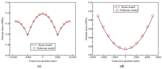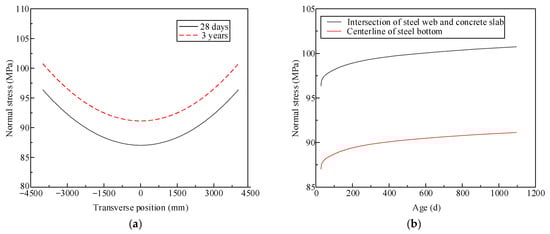 Figure 18 exhibits the stress distribution of the bottom flange of the steel beam and the change over time. Figure 18a shows that the stress at the steel web–concrete slab intersection increases from 96.349 MPa on the 28th day to 100.739 MPa in the 3rd year; the stress of the centerline of the steel bottom increases from 87.039 MPa on the 28th day to 91.133 MPa in the 3rd year. Figure 18b shows the variation in these stresses with time and reveals that the stress of steel slowly increases after the 400th day.