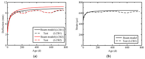 Figure 13 shows the time-dependent variation in the vertical deflection of the composite beam. Figure 13a indicates that the long-term vertical deflection in the 3rd year is 47.01% larger than that on the 28th day. The time-dependent variation in the deflection at mid-span is shown in Figure 13b. It can be noted that the vertical deflection increases gradually over time, but in a narrower range.