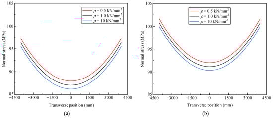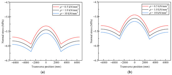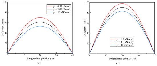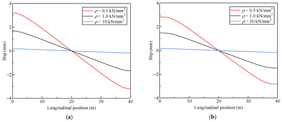 - Compared with the model with ρ = 1 kN/mm2, the vertical deflection at mid-span in the 3rd year of the model with ρ = 0.5 kN/mm2 is 8.40% larger; the interface slip at the end is 90.62% larger; the mid-span vertical deflection in the 3rd year of the model with ρ = 10 kN/mm2 is 7.90% less; and the interface slip at the end is 89.20% smaller.