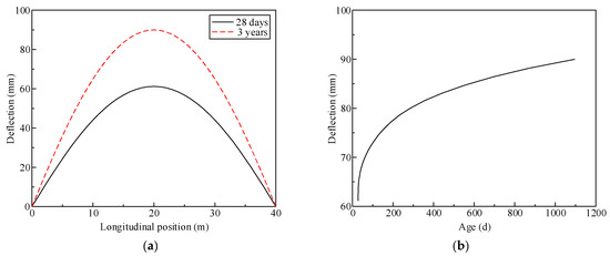 Time-dependent analysis of the above composite box beams focuses on the mechanical responses on the 28th day and in the 3rd year. Figure 13, Figure 14, Figure 15, Figure 16, Figure 17 and Figure 18 exhibit the time-dependent responses of the composite beams, including the vertical deflections, interface slip, warping intensity function on the concrete slab due to shear deformation, warping intensity function at the bottom flange of the steel beam due to shear deformation, and stresses on the concrete slab and at the bottom flange of steel beam, respectively. Figure 13a, Figure 14a, Figure 15a, Figure 16a, Figure 17a and Figure 18a show the distribution of these responses on the 28th day and in the 3rd year, while Figure 13b, Figure 14b, Figure 15b, Figure 16b, Figure 17b and Figure 18b show the changes over time.