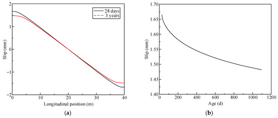 Figure 14 shows the time-dependent interface slip between the concrete slab and the steel beam. This response is consistent with the common observation that obvious slip often occurs at the end of composite beams. The interface slip at the end of the composite beam continually decreases from 1.665 mm on the 28th day to 1.482 mm in the 3rd year, as illustrated in Figure 14a. Figure 14b shows the variation in the interface slip at the beam end. The interface slip gradually decreases over time, but in a narrower range.