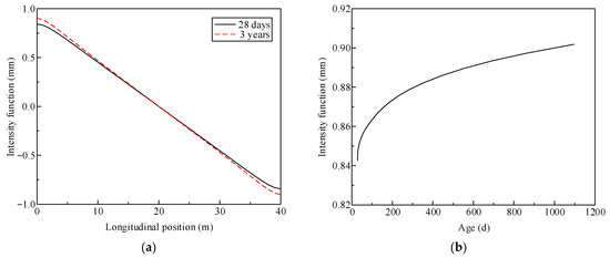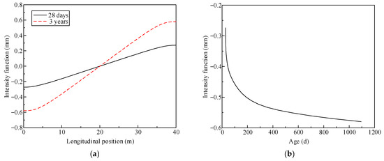 Figure 15 shows the time-dependent variation in the shear lag warping intensity function of the concrete slab. Figure 15a shows that this response is more significant at the support of the composite beam, while this response is 0 at mid-span. This response in the 3rd year was 111.64% higher than that on the 28th day. Figure 15b exhibits the time-dependent variations in the warping intensity function of the concrete slab at the support of the composite beam. The warping intensity function of the concrete slab increases gradually over time, but in a narrow range. The increase slowed after the 400th day.