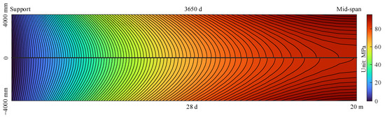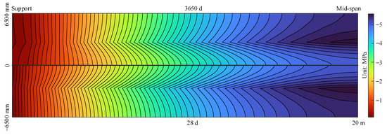 To better show the time-dependent influence, the composite beam on the 3650th day was analyzed. Figure 19 shows the stress distribution on the concrete slab on the 28th and 3650th days. Figure 20 shows the stress distribution at the steel bottom on the 28th and 3650th days. The stress on the concrete slab decreases over this period (28th to 3650th day), and the stress at the bottom flange of the steel beam increases. These results indicate that the creep of concrete produces an unloading effect on the concrete slab.